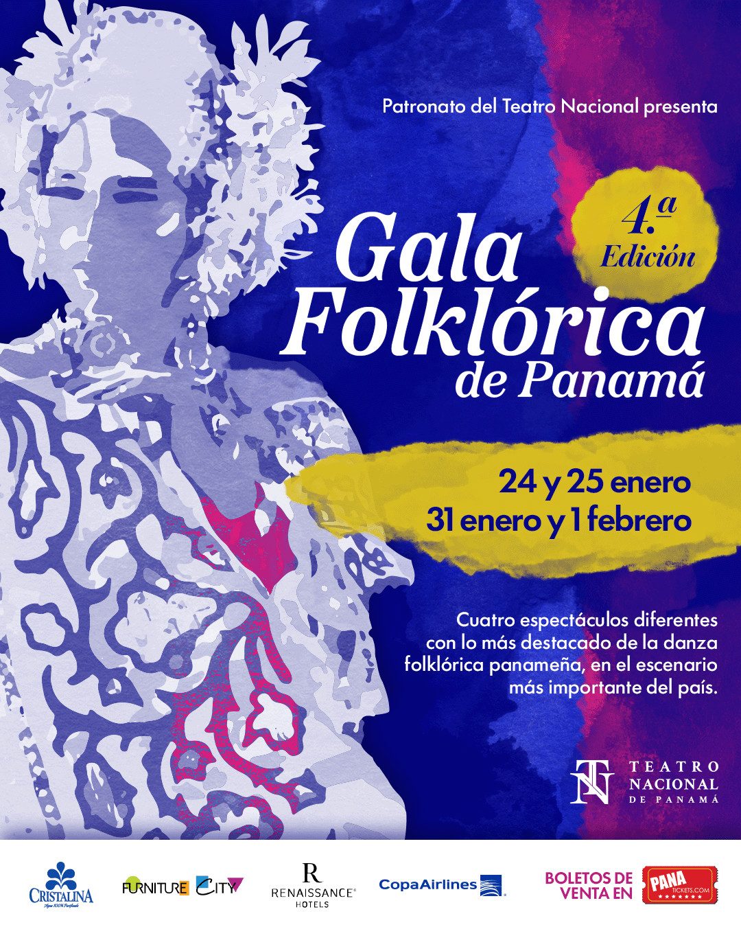¡DOS FINES DE SEMANA DE FIESTA FOLKLÓRICA EN EL TEATRO NACIONAL! El Patronato del Teatro Nacional presenta la Gala Folklórica de Panamá 2026: una celebración de nuestras raíces culturales con lo mejor del folklore nacional en dos fines de semana consecutivos, con cuatro funciones diferentes, únicas e irrepetibles. SÁBADO 24 DE ENERO – 7:30PM [Boletos AQUÍ] BALLET FOLKLORICO SOMOS PANAMÁ / Directora: ASTRID SAAVEDRA BALLET FOLKLORICO PANAMA INTERNACIONAL / Director: ANGEL JIMENEZ ASOCIACIÓN FOLKLÓRICA PANAMÁ DEL ALMA MÍA / Directores: OSCAR RODRÍGUEZ y MARLENIS BARRIOS ANDRÉS VALIENTE DANZAS Y PROYECCIONES FOLKLORICAS / Director: EDUARDO HANSELL ACADEMIA FOLKLORICA DANZAS Y EXPRESIONES DE MI PANAMA / Director: MELVIN SANTOS BALLET FOLKLORICO DANZAS Y TRADICIONES PANAMEÑAS / Directores: ALEXIS TORRES Y RAFAEL BATISTA VITRADANZAS / Directora: MILAGROS BLADES DOMINGO 25 DE ENERO – 4:00PM [Boletos AQUÍ] PROFOLK PANAMA / Directores: DIOMEDES BARRIOS Y KARINA PONCE ACADEMIA DE PROYECCIONES FOLKLÓRICAS ESPLENDOR Y CULTURA DE PANAMÁ / Director: RAMÓN RODRIGUEZ ACADEMIA ALEGRIA Y TRADICIONES PANAMEÑAS / Director: BLAS HERNANDEZ ACADEMIA DE PROYECCIONES FOLKLORICAS BETSY BATISTA / Directoras: LIRA BATISTA Y MILAGROS CONCEPCIÓN BATISTA PROYECCIONES ESCÉNICAS P.A.T.R.I.A / Directores: MAICKOL DOMINGUEZ Y LUIGI ESCOBAR AGRUPACION FOLKLORICA RAZA & DANZA / Director: RODERICK RIVAS AGRUPACIÓN FOLKLÓRICA SENTIR COLONENSE / Director : EDGAR HUSBAND SÁBADO 31 DE ENERO / 7:30PM [Boletos AQUÍ] BALLET FOLKLORICO PANAMA FANTASIA / Directora: DANIA DIAZ FOLKLORE DANCE STUDIO / Directores: ODETTE CORTEZ Y RAFAEL CHONG ACADEMIA FRANCISCO DE LEÓN / Director: FRANCISCO DE LEÓN CONJUNTO DE PROYECCIONES FOLKLORICAS MI ORGULLO ES PANAMA / Directoras: ELEYDA PINTO DE SOLÍS Y GLORIELA PINTO DE SOLÍS ACADEMIA DE BAILES Y EXPRESIONES FOLKLÓRICAS PANAMÁ (ABEFPA) / Director: JUAN MANUEL LARA GRAN BALLET FOLKLÓRICO INTERNACIONAL PANAMÁ FUERTE RAZA / Director: HECTOR IBARRA BALLET FOLKLÓRICO NACIONAL PANAMÁ CANTA Y BAILA / Director: FRANCISCO ALONSO DOMINGO 1 DE FEBRERO / 4:00PM [Boletos AQUÍ] LEGUIZAMO’S DANZAS Y TRADICIONES / Director: JUAN MIGUEL LEGUIZAMO BALLET FOLKLÓRICO RITMOS Y RAÍCES PANAMEÑAS / Director: EDGAR ALEXIS VILLAVERDE PRODUCCIONES ARTISTICAS SOY DE PANAMA / Director: PACIFICO QUINTERO BALLET FOLKLÓRICO ETNIAS PANAMÁ / Director: VÍCTOR PINILLO PROYECCIONES RITMOS Y TRADICIONES / Director: GINO HERRERA ACADEMIA FOLKLORICA CULTURAS PANAMEÑAS / Directores: LEONARDO Y LOYDA AGUILAR CONJUNTO FOKLÓRICO DEL CANAL DE PANAMÁ / Directores: JOSE MANUEL MEDICA, LUIS RODRIGUEZ, JUAN MANUEL LARA La Gala Folklórica de Panamá es un encuentro de destacadas agrupaciones folclóricas que interpretan los bailes y manifestaciones más representativos de cada región del país, desde los ritmos tradicionales hasta las expresiones contemporáneas que enriquecen nuestra escena cultural. Un homenaje vibrante a la diversidad, la identidad y las tradiciones panameñas en uno de los eventos culturales más significativos del país. Una experiencia escénica única, ideal para familias, turistas, jóvenes y amantes de nuestras tradiciones, que combina música, danza y la energía contagiosa que celebra lo panameño con alegría y orgullo. Asegura tu asiento en esta celebración de nuestras raíces. Boletos de venta AQUÍ *Información sujeta a cambios.