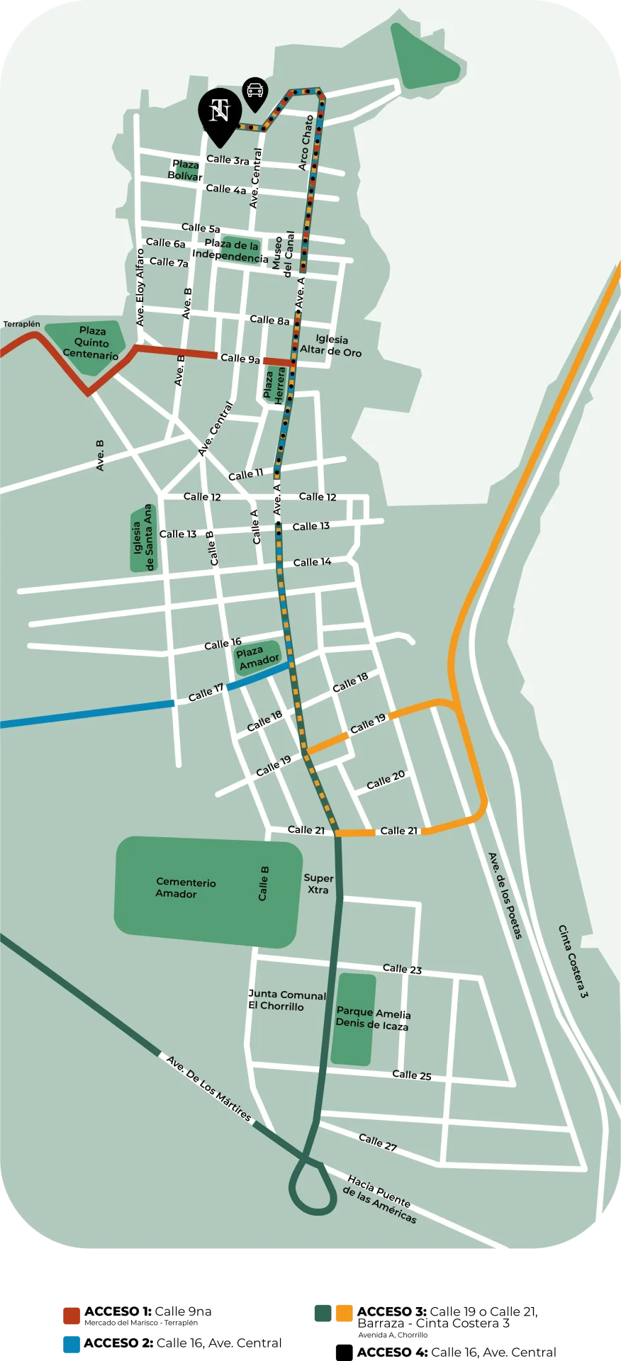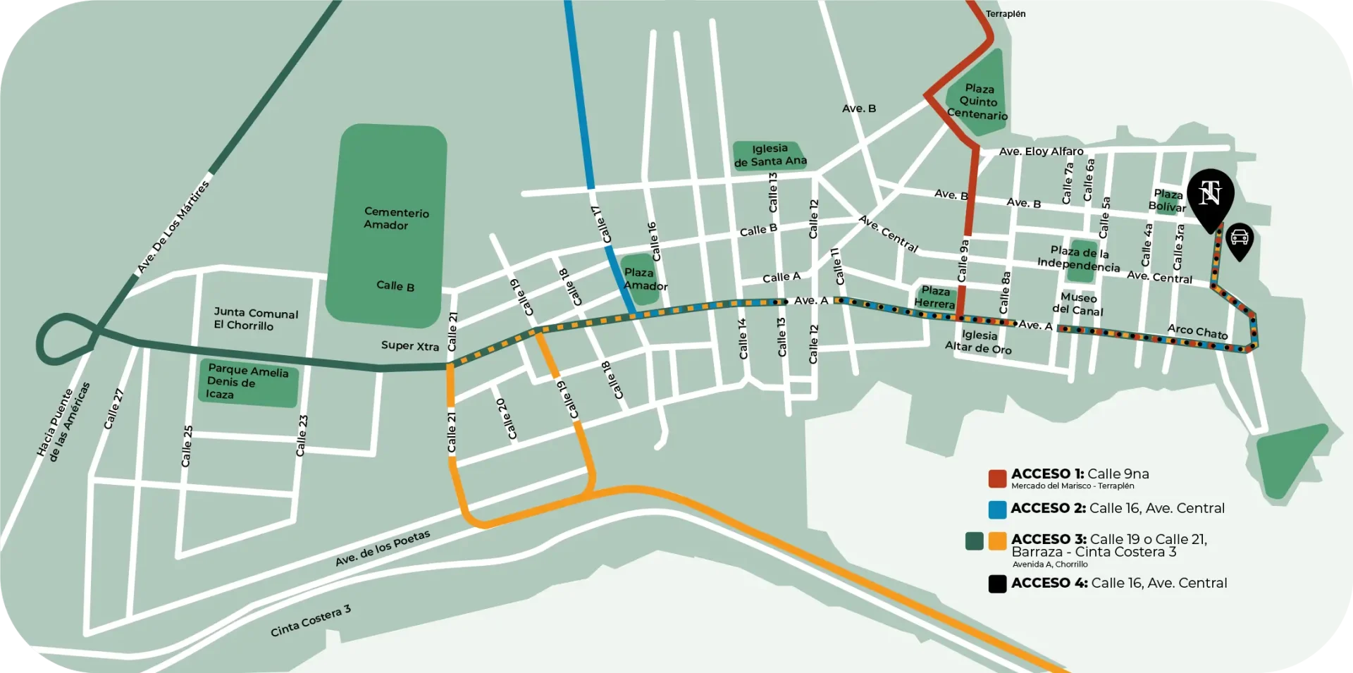 Tome la Cinta Costera 3 en dirección hacia el Maracaná y tome hacia la derecha después del tramo marino, en Calle 21 (Colegio Manuel Amador Guerrero), doble a la derecha en Avenida A y siga la vía hasta hacer el retorno y doblar a la derecha en Calle 2da.